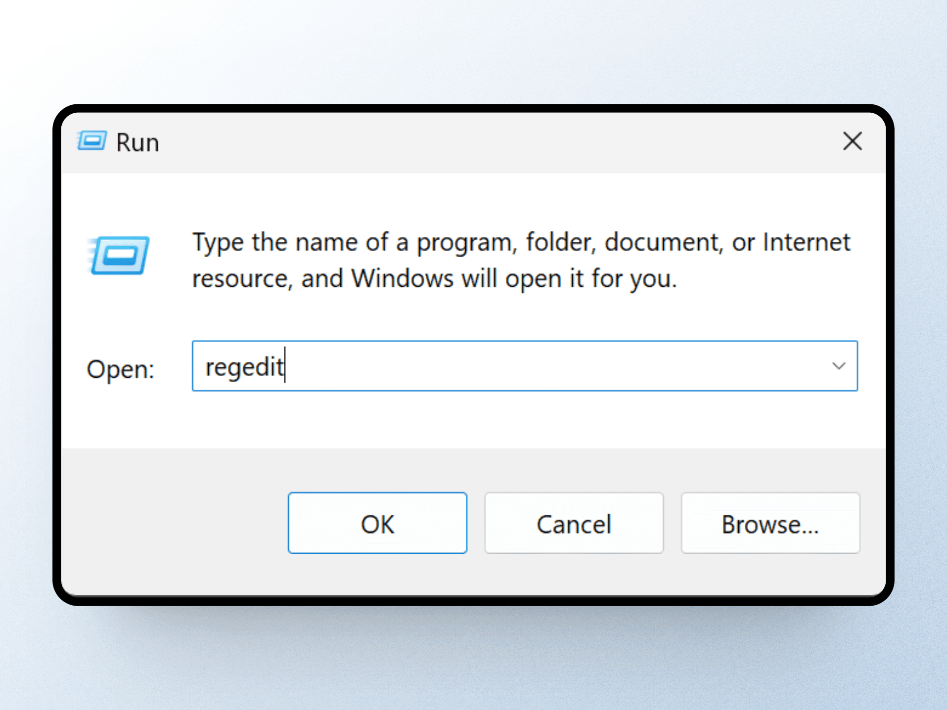 regeditin the Open box and click "OK."