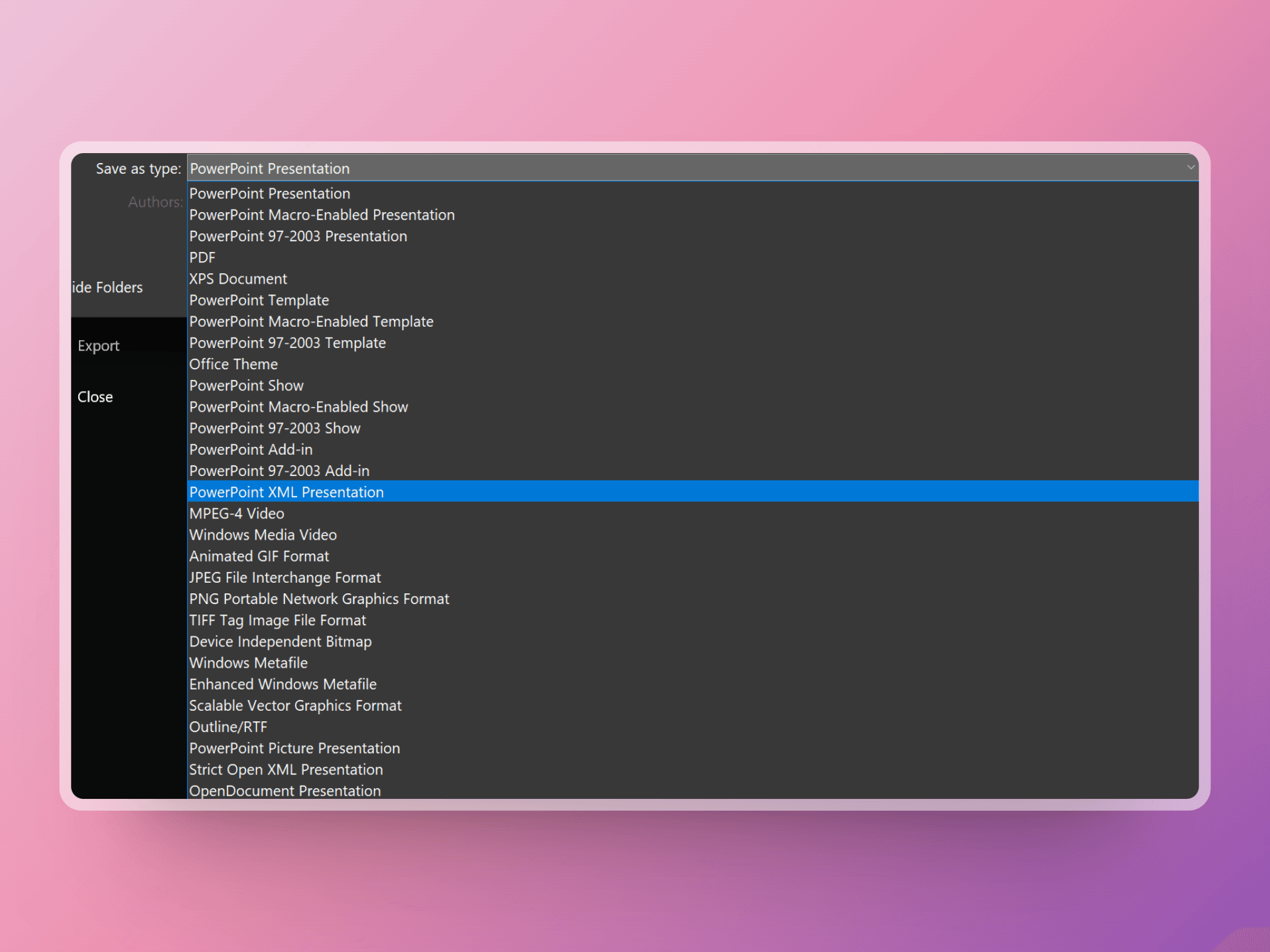 PowerPoint XML Presentation (*.xml).Savethe file.